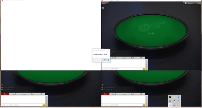 Во время игры при открытии столов случайным образом появляется ошибка (скрин прикреплен), которая потом повторяется при повторном входе в клиент, при этом спустя какое то время (час - два) ошибка пропадает и затем снова в рандомном порядке появляется при открытии стола. На другом устройстве все в порядке и работает, то есть причина скорее всего в компьютере, однако как ее установить пока представляю с трудом. Может быть кто-то сталкивался?