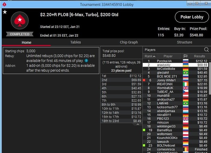 Сегодня была финалка за 16,50 $. В итоге только 4-е место и 114$.