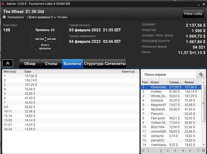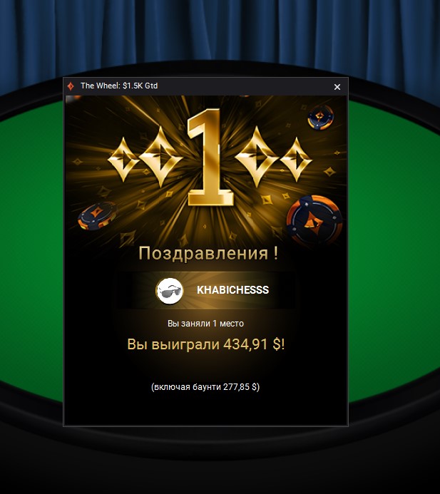 А я вчера затащил ТОП-1 в турнире на патипокере - The Wheel 12,50$.