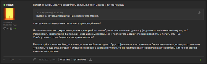 И когда речь идёт о минусике в репу эти люди готовы пойти на все, даже на клевету в сторону человека с которым и дел то никогда не имели. Только представьте, насколько это ничтожно, человек париться из-за такой хуйни, как минусик в репутации на сайте😂 бедолага спит плохо из-за этого)
