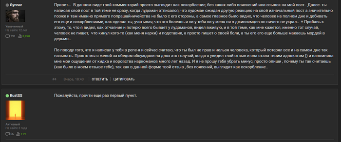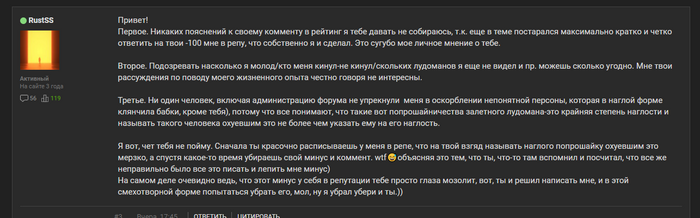 запилил целый пост с кучей скриншотов и вываливанием в паблик личной переписки только потому, что чел поставил тебе минус 100 в репу, а потом попросил тебя даже не убрать минус, а более четко сформулировать причину твоего минуса.