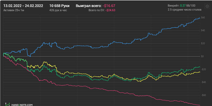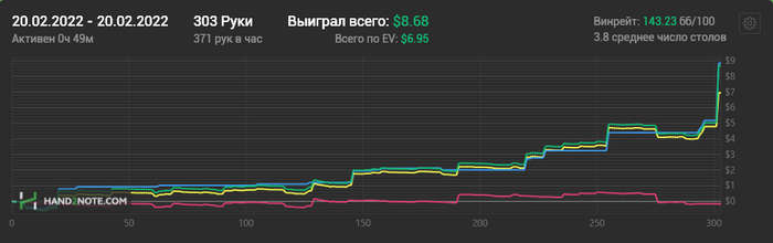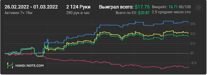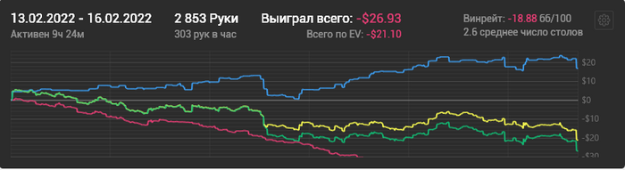Играл активно пару месяцев в 2018 году, было в районе 2бб/100. После этого были перерывы по пол года. Прошлым летом депнул на старзы 10$, довёл до 100$!
