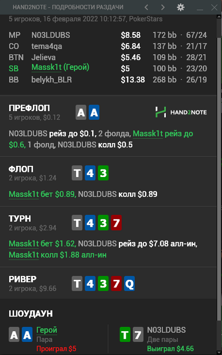 Ривер ( ) ПУШ, все сеты уже фулы, две пары прям очень очень очень редко, из флешей только KQs адекватные, может немного рандома ( и вот получается что если у него будет одна комба двух пар и стриты на 98 то колл прям еле еле (без учета рейка) Без радости но колл (во время игры подумал что если он способен что-то переиграть на надо коллить не зря же тянули)
