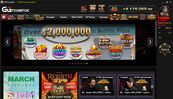 Поменять валюту можно только в лобби клиента путем нажатия на область валюты: