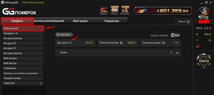 Либо в разделе "Профиль" -> "Мой кошелек":