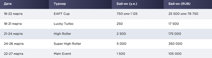 На смену перенесённому на октябрь этапу EPT приходит первый в новом году этап EAPT, который пройдёт с 18 по 27 марта.