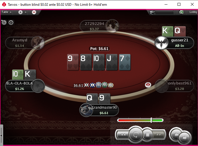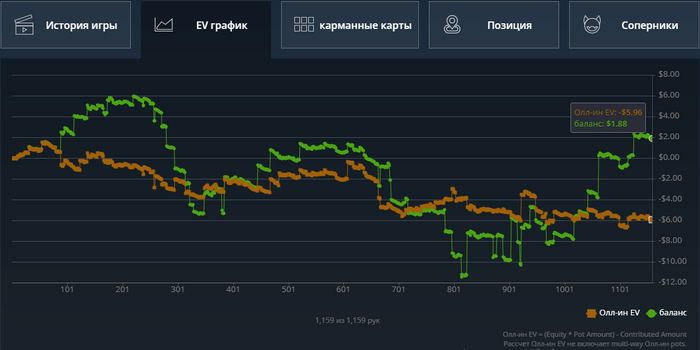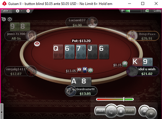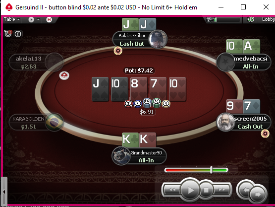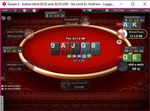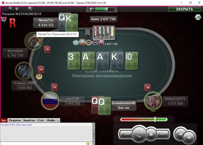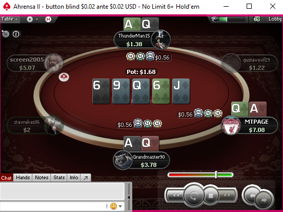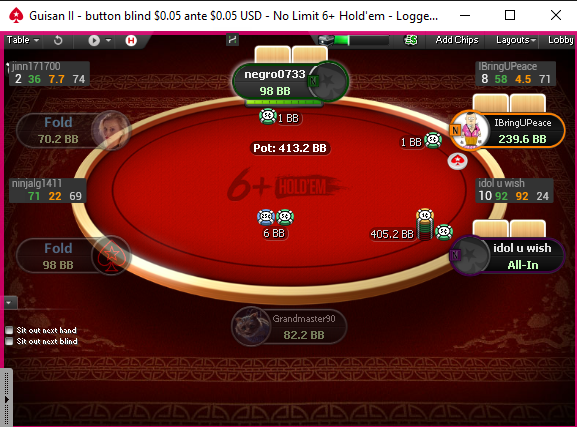 В общем катаю я 3 стола 6+ NL2 и шотаю 1 стол 6+ NL5 загружая 50 бб. Туда сюда 60-70-40-30-и вот когда у меня остается 16 бб садят просто сумашедшего чувака который видимо решил поугарать. БР не большой дозагруз не стал делать а тем временем чувак каждую раздачу тупо пушил. Тут я ловлю на нем х2 и тог у меня 32 бб потом ещё чётка х2 опять и у меня уже 80 бб на NL5. Но в одной раздачи проигрываю ему выставившись старше. Не долго думая я принимаю решение сделать аддон в 100 бб ну и понеслась. Он ставит а мне все не заходит но в итоги я поймал это удвоение. Безумец который был за столом ставит 400 бб