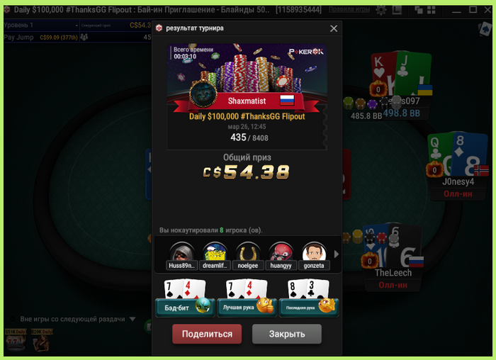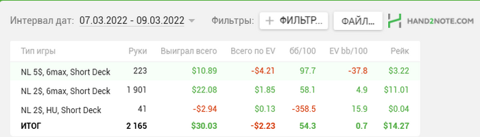 В кассе вышло ~ $130. Из них $100 я вывел и на $30 начал гонять туда сюда во все подряд SNG 9max KO, турниры, 6+ и так далее.