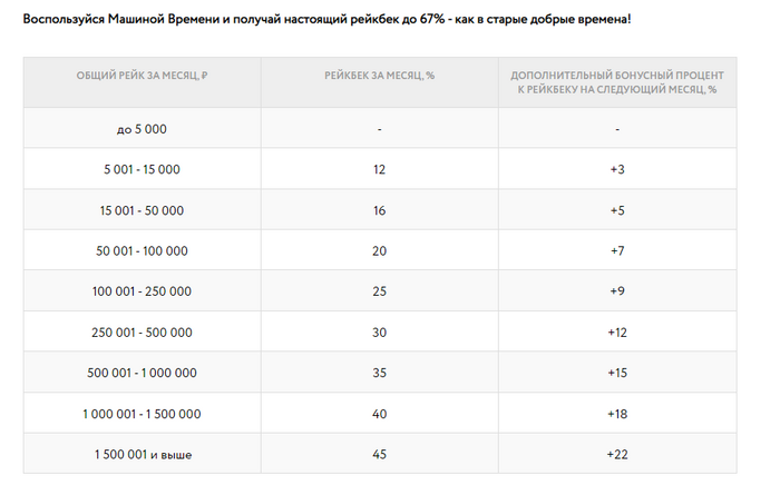 pornodemon, привет. По РБ на ПД надо перейти сразу на рейкбек-программу "Машина времени" (как это сделать почитай в их разделе Акции). % РБ зависит от генерируема месяца в этом и предыдущем месяце. На следующий месяц идет надбавка по РБ в зависимости от того сколько сгенерировал рейка в предыдущем месяце. Прикрепляю скрин с РБ по программе "Машина времени". Максимально возможный рейкбек = 67%. Для этого ежемесячно нужно набивать >1 500 000руб рейка. Но там есть множители, например, в бусте 25\50 идет повышенный возврат рейка. В данный момент +50% к очкам.