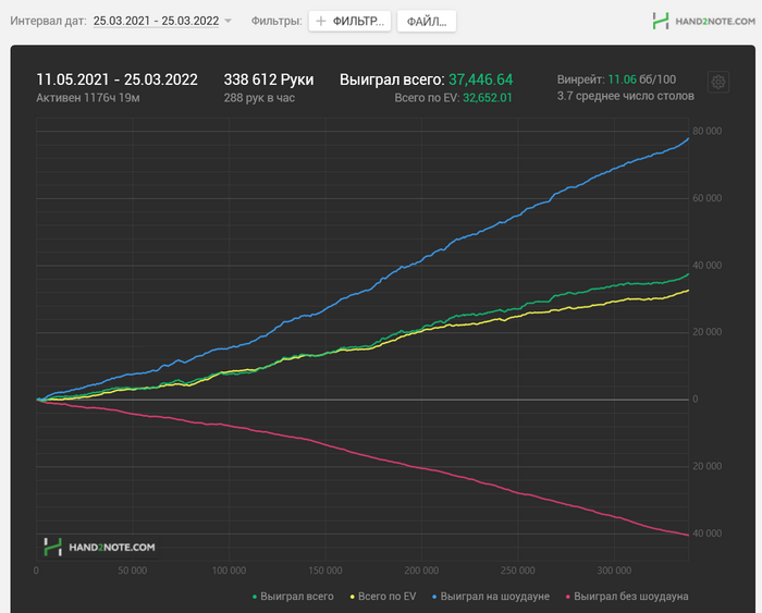Как итог, загоревшись идеей и поддержкой Миши, начал пробовать играть 0.25-0.5$ cнгшки, откатав 500 туриков, с небольшим плюсом, Миша помог мне вступить в команду FortunaTeam, в которой я сейчас и обучаюсь. Мои результаты + EV за 2021-2022 г прикладываю ниже. Последние 2 месяца играю mtt аби 7, к сожалению не складывается и я сосу сосули (-1000$ мейк), в этот период я осознал, как хорошо иметь "подушку безопасности" или Завод, который может прокормить меня и мою семью в трудные времена.