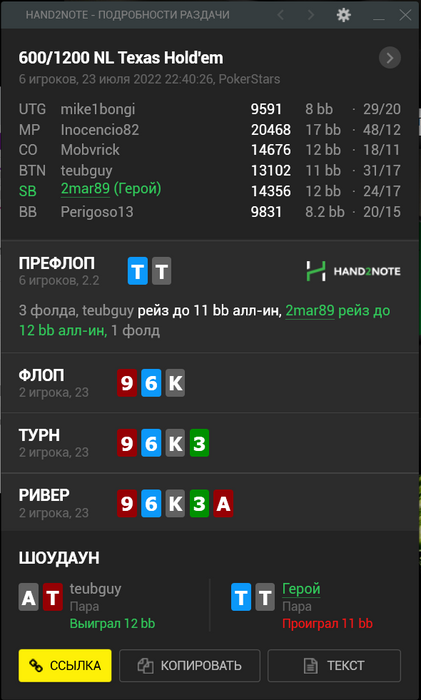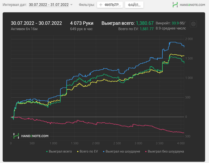 Начну с приятного, наконец-то удалось затащить дешевый турнирчик за 1 евро, когда был в команде выигрывал его 2 раза, очень рыбный пруд (желтые метки - фиши), на финалку вышел со стеком в 3 раза меньше чем у лидера, играли хэдзап 2 часа, но я не сдавался и переиграл оппонента. Да и в целом тот вечер по EV вышел отличным.