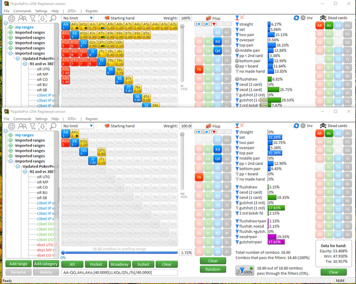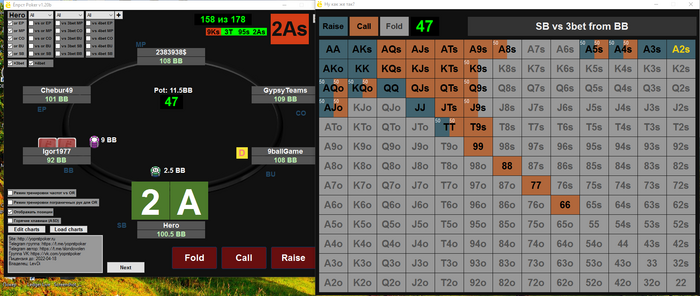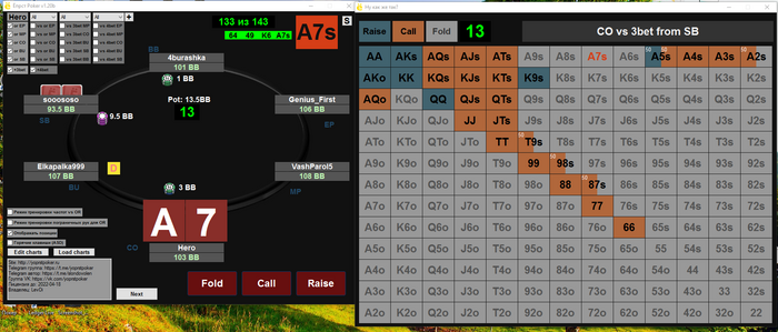 Разбирая раздачи, особенно пост-флоп, лучше описывать подробно не только ситуации которые происходят, но и те которые предположительно могут произойти, описывая их с помощью эквилятора открыв его второй раз. Весьма сложно себя заставить делать на столько глубокий анализ, но нужно себя заставлять, иначе прогресс в уровне игры можно развивать гораздо дольше.