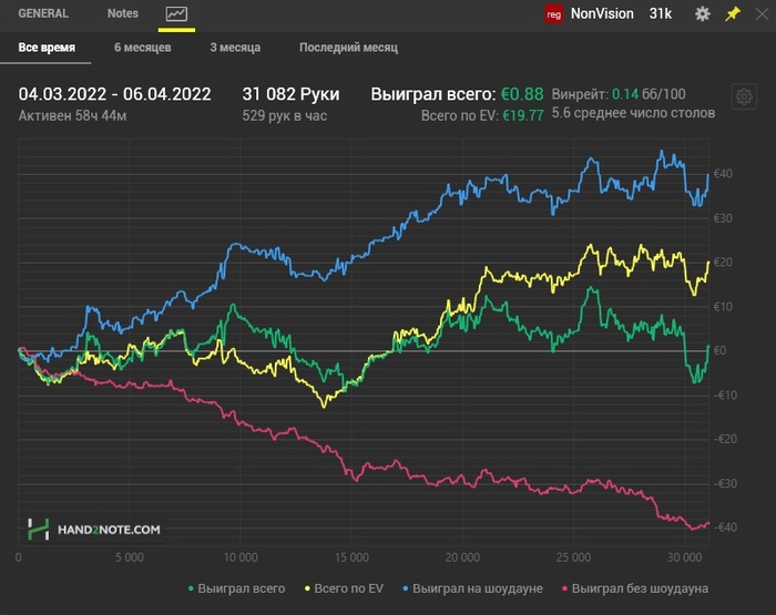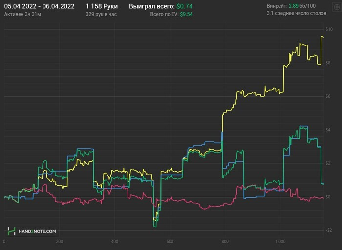 Я понимаю, что попал в стрик и все такое. Но все же уже точно осознаю, что делать норм винрейт не напрягаясь, как раньше, здесь вряд ли у меня поличится и дело не только в высоком рейке. Депозитить БР для игры на NL20, где рейк пониже, как-то пока не хочется. Я даже кэшаутить минималку еще не пробовал. Так что пока буду дальше NL2 играть и по-тихоньку пытаться переходить на NL4-10 и выше. Еще проблема, что статус Star сгорает 1 мая, набить 5000 поинтов для сохранения статуса вряд ли успею.