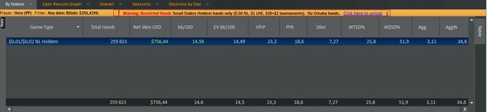 Теперь более подробно о покере. Играл микролимиты NL2-25 в основном на пати (хотя на ipoker в 2018-19 тоже приличная дистанция была наиграна). Суммарно за все время наиграл наверное около 1.5кк рук. После ухода пати из России перешел на старзы, там поле даже еще мягче показалось. Ну все, думаю, здесь и буду наживать по-тихонечку. Ага, даже 10к рук не успел наиграть, как и они закрыли доступ .