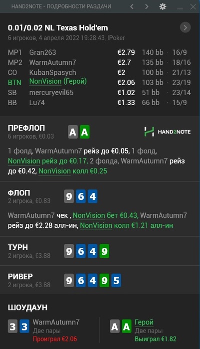 Vadosov, Спасибо больше, и тебе удачи! Ну тут на кбеты флоп не все хорошо фолдят, хотя в позиции можно и поднять кбет до 80-90%. Сейчас он около 70 с лишним.