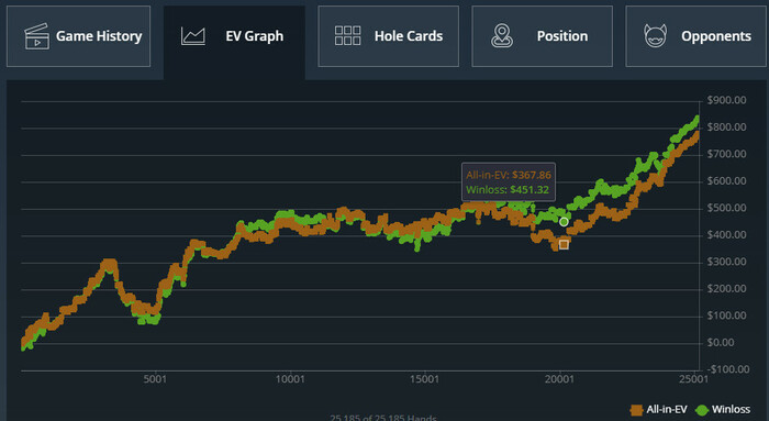 Вторая версия, менее вероятная: хэндхистори с ГГ (через конвертер) как-то сильно некорректно трекается в Х2Н (и сайтами статистики). Почему я эту версию не исключаю? Потому что по кассе (примерно) у меня у этом месяце чистый профит в два раза выше, чем показывает Х2Н.