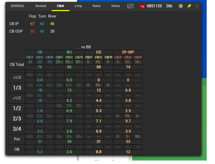 Но это не аксиома, все варианты верны. Только будет ситуация что человек контбетит 10 процентов и в твоих значениях будет например 3-треть, 3- полбанка и 3-банк, а в моих 33 - треть, 33 - пол и 33 -- банк. Важно это понимать тогда. Но мне показалось проще это оценивать моим вариантом тк мозг более логично и быстро представляет что треть рук человек контбетит от своего открытия например 20 процентов. А в твоем будет что у человека рейндж контбета 3 процента от диапазона открытия 20 процентов.
