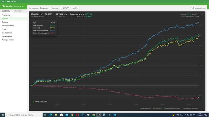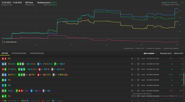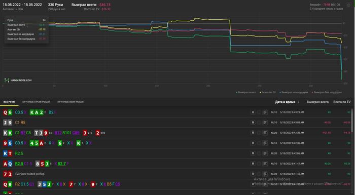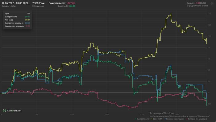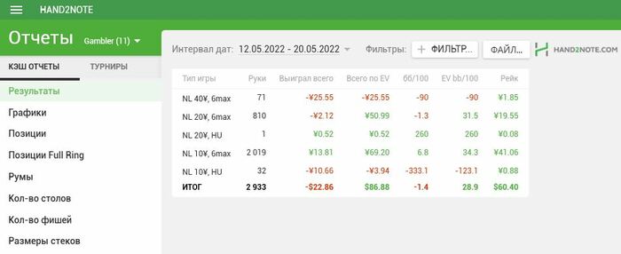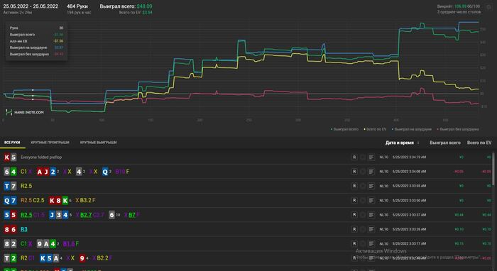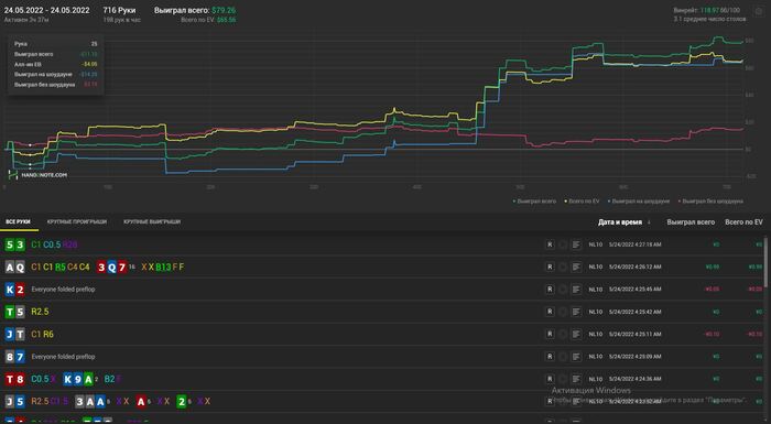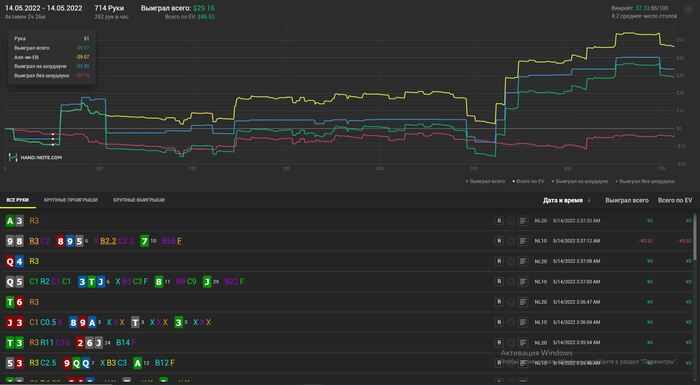 Пропал на пару дней так как приболел к сожалению. В отвратительном состоянии отыграл сессию. Но результаты порадовали. А что самое приятное, так это то что наконец сессия в которой EVшка не выше зелёной. Играл в свой покер, могу выделить 2 кола пот бета на ривере против маньяка на 4 стрит доске, но так или иначе 2 стека я у него забрал в итоге и оверфолд с ТПТК на тёрне против бета рега, это скорее всего были ошибки, в остальном игрой доволен. Хотя в идеале просмотреть всю сессию на здоровую голову.