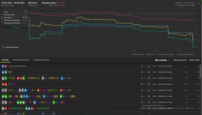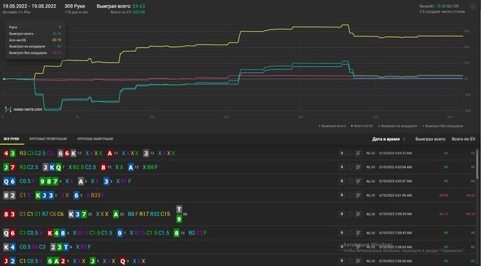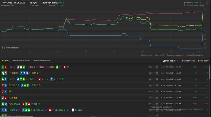 Хотел бы поделиться лучшим отрезком. Очень хочу вернуться хотя бы отчасти к таким результатам, сейчас на 80к рук винрейт 30-32бб\100 в основном на нл10
