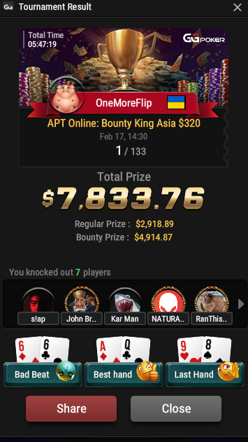Брал тренировку в начале месяца, благодаря тренеру посмотрел на игру под другим углом. Начал играть в покер, обдумывая свои решения, а не в гринд по 12 столов. После тренировки винрейты выросли в 2,5 раза, хотя месяц был ужасный , стало гораздо больше дипов, правда меньше финалок, немного начал переагривать, нужно больше опыта.
