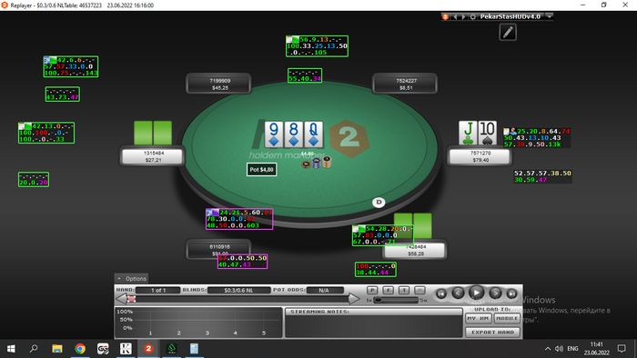 crazyyy93, На флопе я бы не начинал с пот бета, слишком сильно это выглядит в 2-их. Можно поставить 2/3 3/4, всё таки хочется увидеть здесь кол от рук по типу 9x и 8x, и одновременно не давать шансов банка на доезд во флеш.