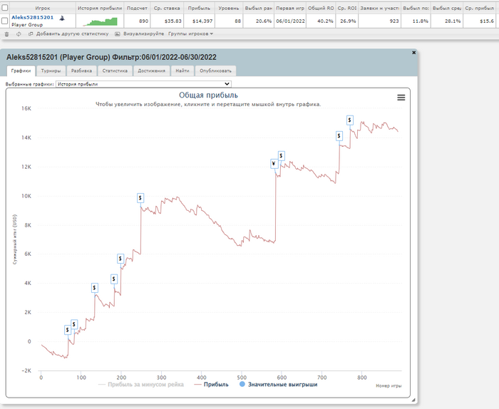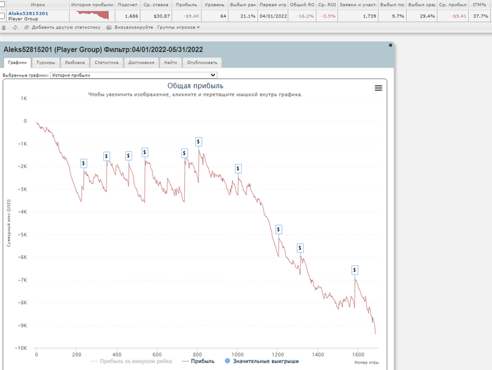 Всем привет , привет . Я тут немного пропал . Был в плотной катке. Вот и закончился мой марафон, хотелось бы подвести итоги . Сразу хочу сказать, что поставленную задачу я не выполнил , ушёл в мейк. Цель была за 2 мес рой 20% и 3000 турниров. В целом , были и заносы , но их оказалось совсем мало , чтоб показать достойный результат . Но я не падаю духом , буду идти дальше к целям . Это лишь одна попытка , а на пути у меня много возможностей. Буду использовать все. Всем мира и удачи