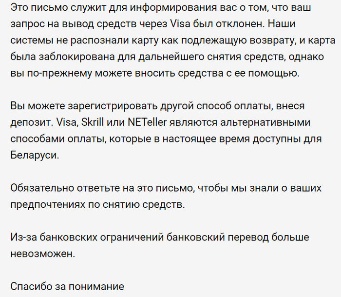 Я позвонил в банк, но мне сказали, что попыток перевода средств не было, за исключением перевода 10$ тех о которых я говорил ранее. Все попытки общаться с саппортом не обвенчались успехом. Они говорят одно и то же. Я написал письма везде где только можно, ясного ответа нет. Один из таких ответов это : "Вы не сможете использовать данную карту для вывода, вне зависимости от действий.", просим вам попробовать другой способ вывода Viza, Neteller, Skrill. Так же отмечу, что эту карту из способов вывода они удалили, а деньги которые я выводил не вернулись в кассу, они все так же лежат в обработке.