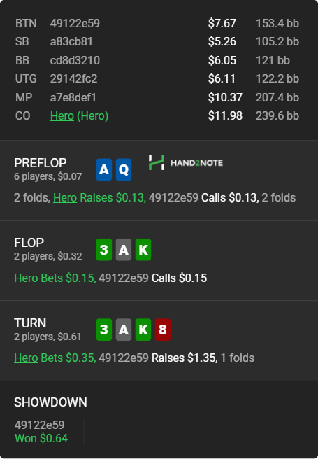 Префлоп сайзинг 6.5бб много, выдаёт силу руки. Стоило сделать 3бб максимум. Но в виде исключения под фиша пойдёт.
