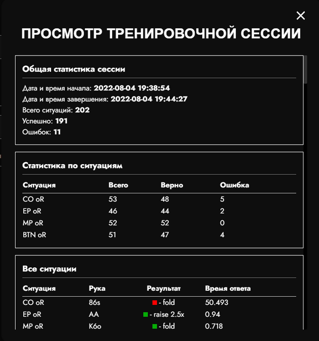 После добавления в тренажер спотов CO и BU стало больше ошибок. Во много связываю это с тем, что мало времени уделил самим чартом и слишком быстро перешел в тренажер. Нужно будет откатить, и пройтись по своей методе-заучивания чартов по диапазонам, и после уже оттачивать в тренажере до неосознанного владения ими.