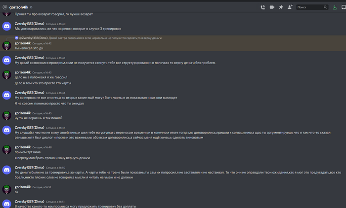 Да проводил тренировку данному человеку,потом он попросил чарты которыми я пользуюсь. Да,это гто чарты,и да их можно достать в открытом доступе,но часто люди ленятся их искать или структурировать,поэтому просили и не раз. Какие именно чарты он хотел получить я до сих пор не понимаю. После общение в дискорде(внизу будет скрин) понял,что аргументов у него нет и с любой точки зрения я не виноват в данной ситуации. И даже в данной ситуации хотел найти с человеком компромисс. Но данный человек уже успел обидеться и пошел плакаться сюда. И да,по поводу тренировок можете не писать,данный пост не актуален,в связи с договоренностями с проектом. (важно было написать ибо он поднял этот мертвый пост наверх)