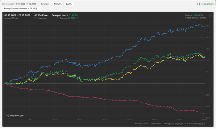 Shantz @ 11.09.22VAZOVSKY, сделаю ремарку: винрейты в приложениях у большинства игроков всё же ощутимо выше, чем 4бб/100. Двузначный винрейт на нл50 -- это скорее норма, чем исключение.