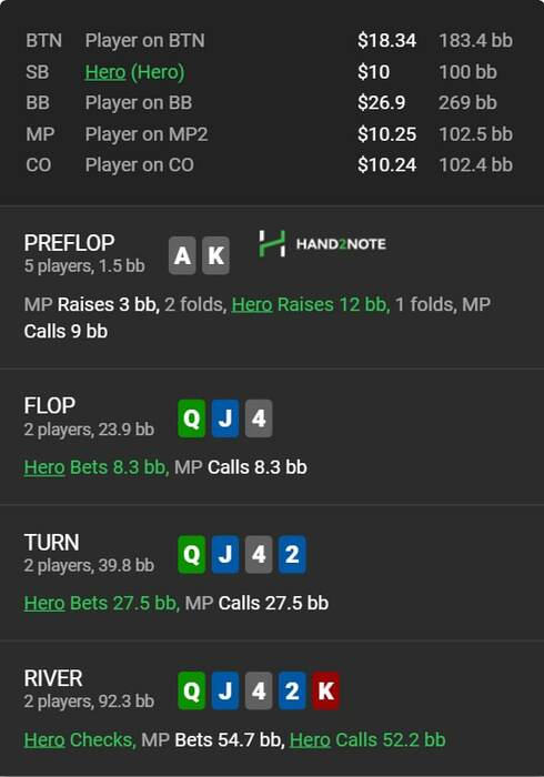 по поводу блефа интересно, не слишком ли высоко стоят десятки для блефа? не лучше ли блефовать условные А5с или к7с (если такое 4бетишь)? возможно даже блеф с а8с или А9с, опять же если 4бетишь. на этом борде я больше бы боялся не ДТс у опа увидеть, а сеты 88 и 99, или 67с. по крайней мере в моем поле скорее отколят 4бет с 67с , чем с ДТс, но учитывая твой маленький сайз, ДТс тоже есть. но я в любом случае для блефа бы выбирал руки слабее, блокеры на сеты (как раз выбивая условные ТТ у опа).
