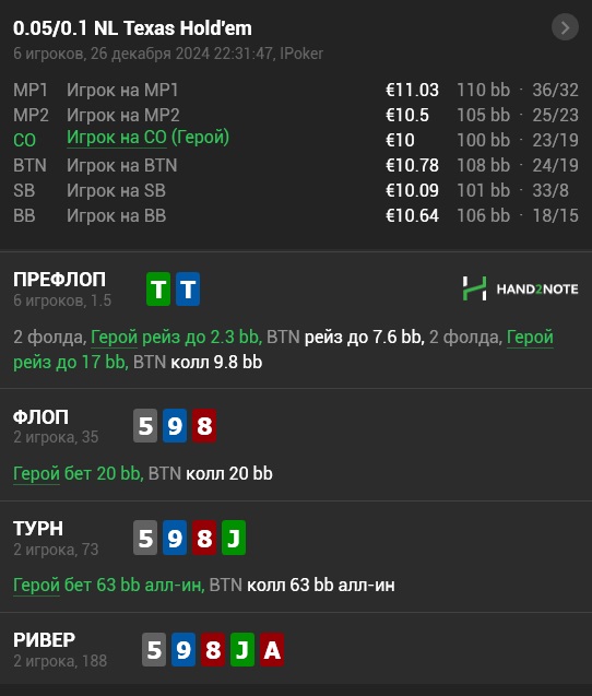 По сайзу в 4бет поте согласен, на самом деле я больше играю за 10 и 25 % в 4бет потах, но иногда поляризуюсь с уязвимыми. С ТТ больше игра в 1 улицу, опп прозрачен становиться в случае колла = можно фолдить, однако на терне я подумал что ТТ чуть ли не единственный мой блеф и я вынужден пихать.
