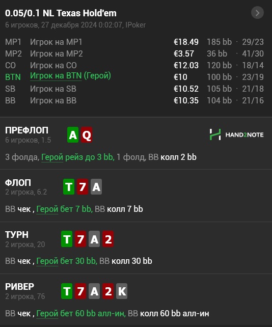 BackInTime, а нам не хватит еквити + фолдэквити за счет блокера на стрит и блокера на тп? Он по сути 77 3 комбы отбивает, может ТТ не трибетнутые 1.5 комбы заложим, может АJ который мы бьем - типо блокер на стрит раз в сто лет - 1 комба. Много фолдит 98.