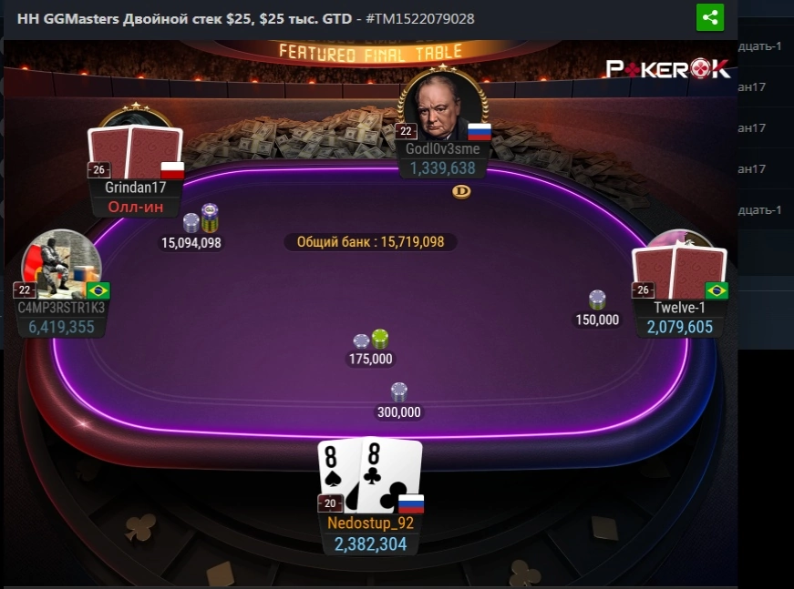 топ 5 килополяна. ГГМАстерс 25$. Самый дорогой турнир в загрузке. Чипак пушит с СО,перед нами два фолда 5 и 7 бб. Мы на бб со стеком 8 бб и карманными 88. Фолд или колл? текущая выплата 1333$ , след пейджамп около 10+ байинов.
