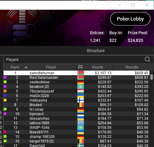 В сентября 2023 в Минске была серия РПТ. Мне по счастливилось на ней по участвовать. Это была моя первая крупная офлайн серия. Я продал доли на 7-8 турниров. Один из них удалось выиграть. Баин был 360уе, участие приняло 93 человека. Нам насыпало 7к + кубок) Ощущение были не передать словами) в будущем планирую посещать такие оф турниры и продавать доли. Если кому интересно можете подписываться на мой ТГ-канал что бы быть в курсе)