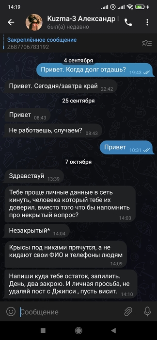 Напомнил про долг? - "ты чего на меня давишь, я так не могу. Завтра скину"