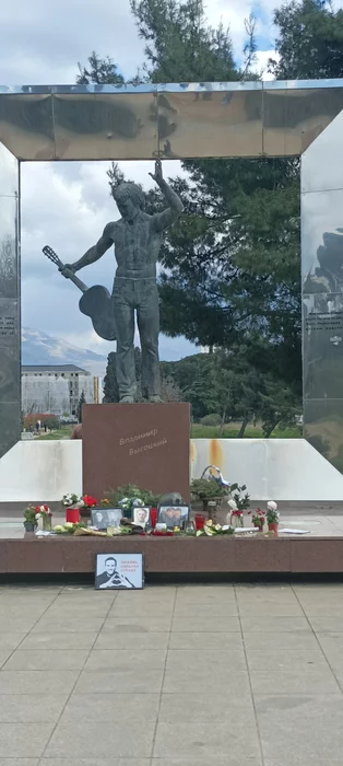 Памятник Высоцкому в Подгорице. Тут же небольшой мемориал Навального.