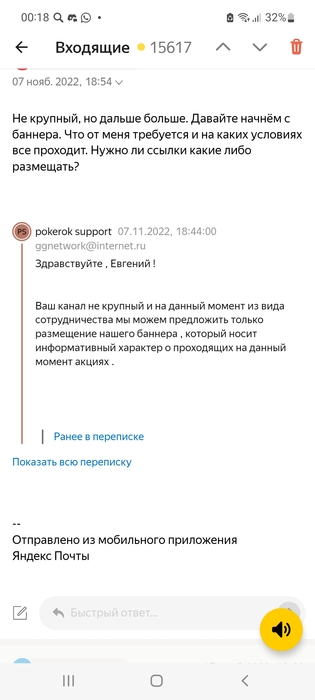 Всем привет. Коротко о себе Евгений 35 лет начинающий стример на твич. Во время очередного стрима в телеграмм пришло сообщение от человека с ником как админа покерка на твиче, с предложением о сотрудничестве в виде размещения баннера на стриме. Расписал условия 150$ плюс билеты на турниры которые нужно играть на стриме и билеты для розыгрыша среди подписчиков. Ну у меня забрало запотело от такого предложения. Он скинул почту саппорта типа покерка. Я туда написал и в процессе переписки попросили код в ответ прислать который на телефон придёт якобы для подключения меня к системе раздачи билетов. Был не дома, а в кайфовой обстановке😁 поэтому не обратил внимания на сомнительный адрес емэйл (во вложении сверху).
