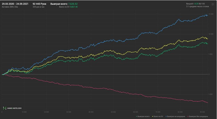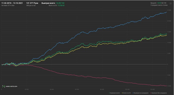 Shad2y, Я столько играть не могу, у меня макс 7 столов, в основном 6 играю и не более 45к рук в месяц, поэтому селекчу довольно внимательно и редко у меня за столом меньше 2-ух фишей. И крайне редко сажусь под агрессивного рега, только если на хорошего фиша в позе.