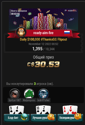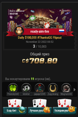 Azilya93, твоя теория не имеет ничего общего с реальностью, увы. Ггкеер вообще не так работает, это фриролл с рандомным количеством участников с рандомным количеством стартовых фишек. Ты зачем то пытаешься высчитать там какое то конкретное число называя это словом ожидание. И ещё добавляешь какую то мистику в флипаут турнир. Этот турнир создан не для заработка, а для привлечения и удержания любителей, некая лотерея. То, что на нем зарабатывается может быть неплохим бонусом для рега, не более того. Например для рега нл 25 он уже слабо ощутим, для нл 50 вообще не заметен на дистанции.