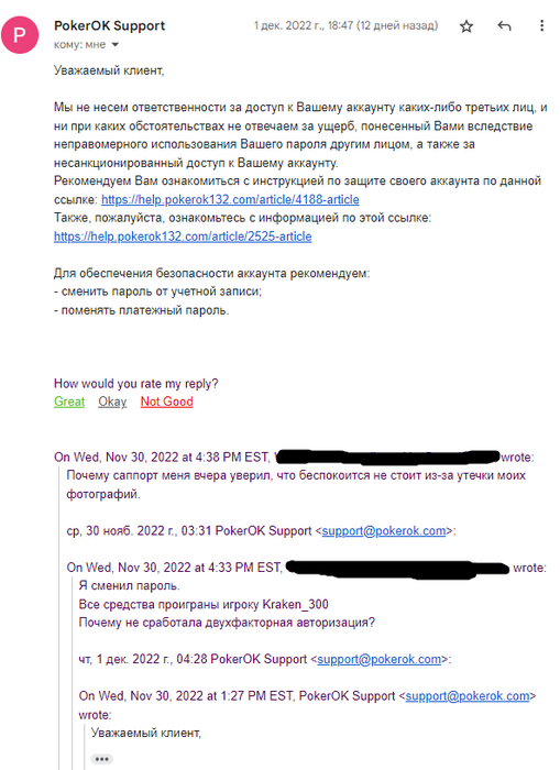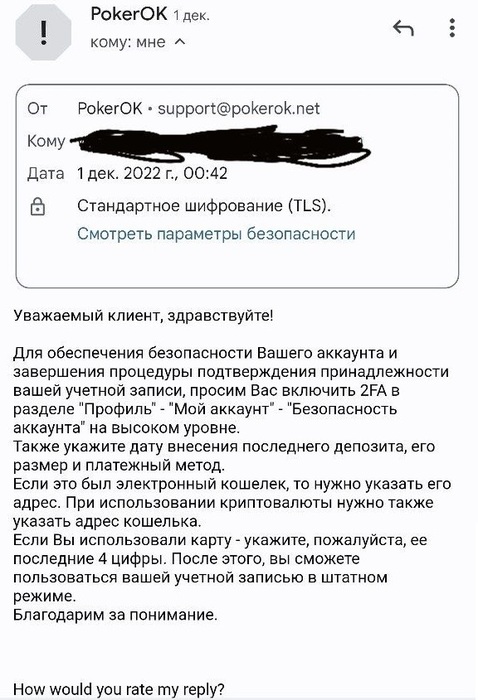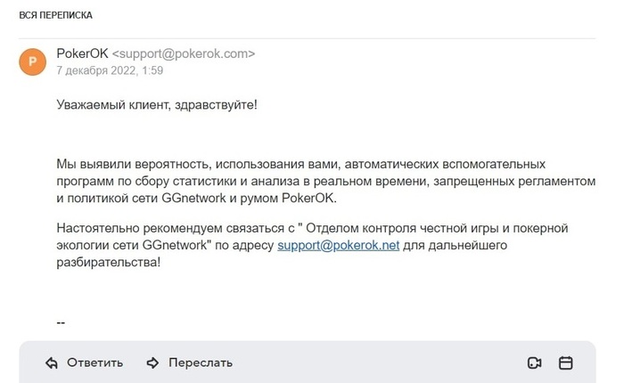 На днях супруге пришло письмо от официального саппорта ПокерОК support@pokerok.com следующего содержания: