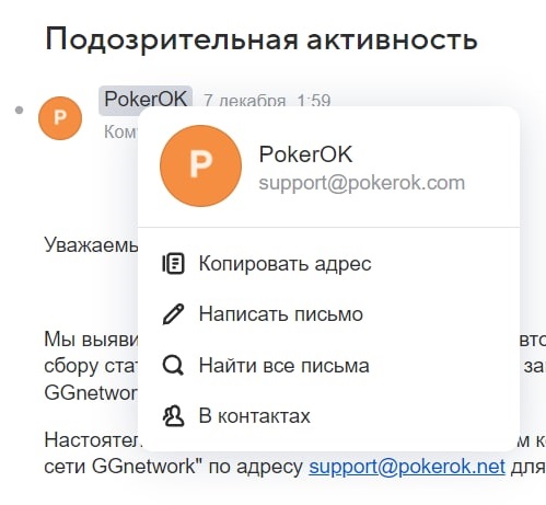 Когда я увидел отправителя я не поверил своим глазам. Несколько раз перепроверил раскладку, не затесалось ли там какой-нибудь кириллической А в адресе (хоть это и невозможно), нуля вместо буквы О. Нет это действительно официальный адрес саппорта Покерок.