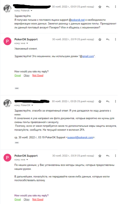 Если вдруг кто-то не знает, то с адреса электронной почты support@pokerok.net, который, как выяснилось выше, принадлежит целому "Отделу контроля честной игры и покерной экологии сети GGnetwork", мошенники успешно рассылают письма и следом взламывают аккаунты, например, у меня, или у автора данной темы https://forum.gipsyteam.ru/index.php?viewtopic=169829#entry7428975