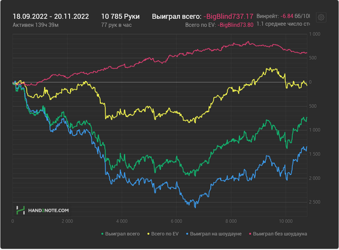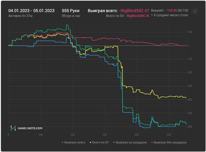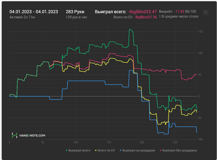 Смотрел график после сыгранных 8-ми турниров: на графике винрейт -40бб/100, а по ев +45бб/100 (желтая вверх, зеленая вниз) - Это значит что меня трахает удача, но действия все правильные?