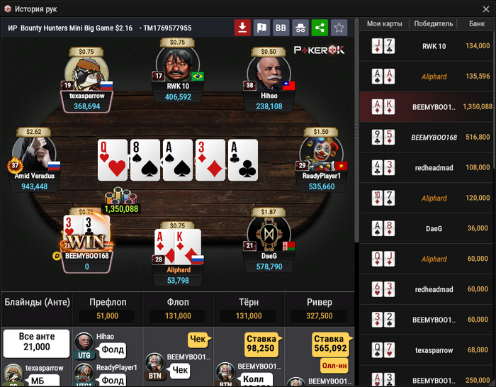 Через 2 часа отошел, решил начать с обучения и параллельно запустил турик за бакс, потом добавил еще один. (БР депнул 50$ на Покерок). И в этих турнирах получилось просто все: доезжали флэши, 2 раза раздали каре, постоянно давали АК АQ. Вот несколько раздач.