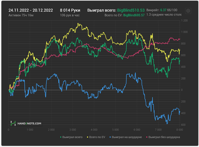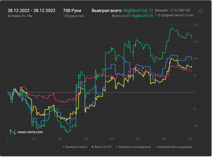 В итоге +5$ к новому БР. Ну и график, как же прекрасно играть в покер, когда все получается)