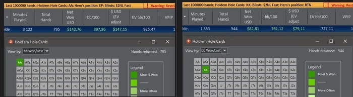 Выбрал второе, но зависит от того знают ли оппоненты что мы играем только этими руками, или они играют против рейнджа. Если знают, то ев будет выше у АА, т.к. это лучшая рука и мы всегда соберем блайнды. А КК соберет меньше, т.к. не бьет АА.