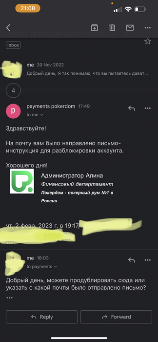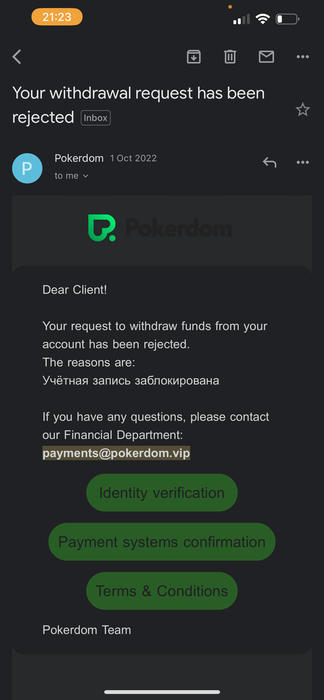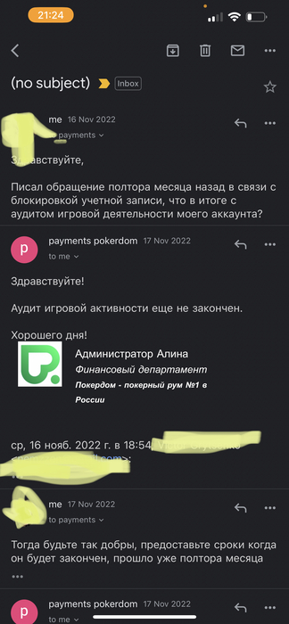 Кратко: играл 2 дня, блекджек и холдем за обычными столами, с депозита 20к плюсанул до 85 (так бывает, что иногда получается). В итоге решил вывести часть баланса (около 50к) и моментально словил блокировку. Написал в поддержку 01.10.2022 по адресу payments@pokerdom.vip с вопросом сколько еще будет идти аудит. Первые полтора месяца никто вообще не называл сроков, потом написали, что максимум 90 дней. Прошло 90 дней, написал опять, дали отписку, что на почте письмо-инструкция для разблокировки и проблем нет, письма нет нигде на моей почте и на любые вопросы/запросы мне не отвечают.